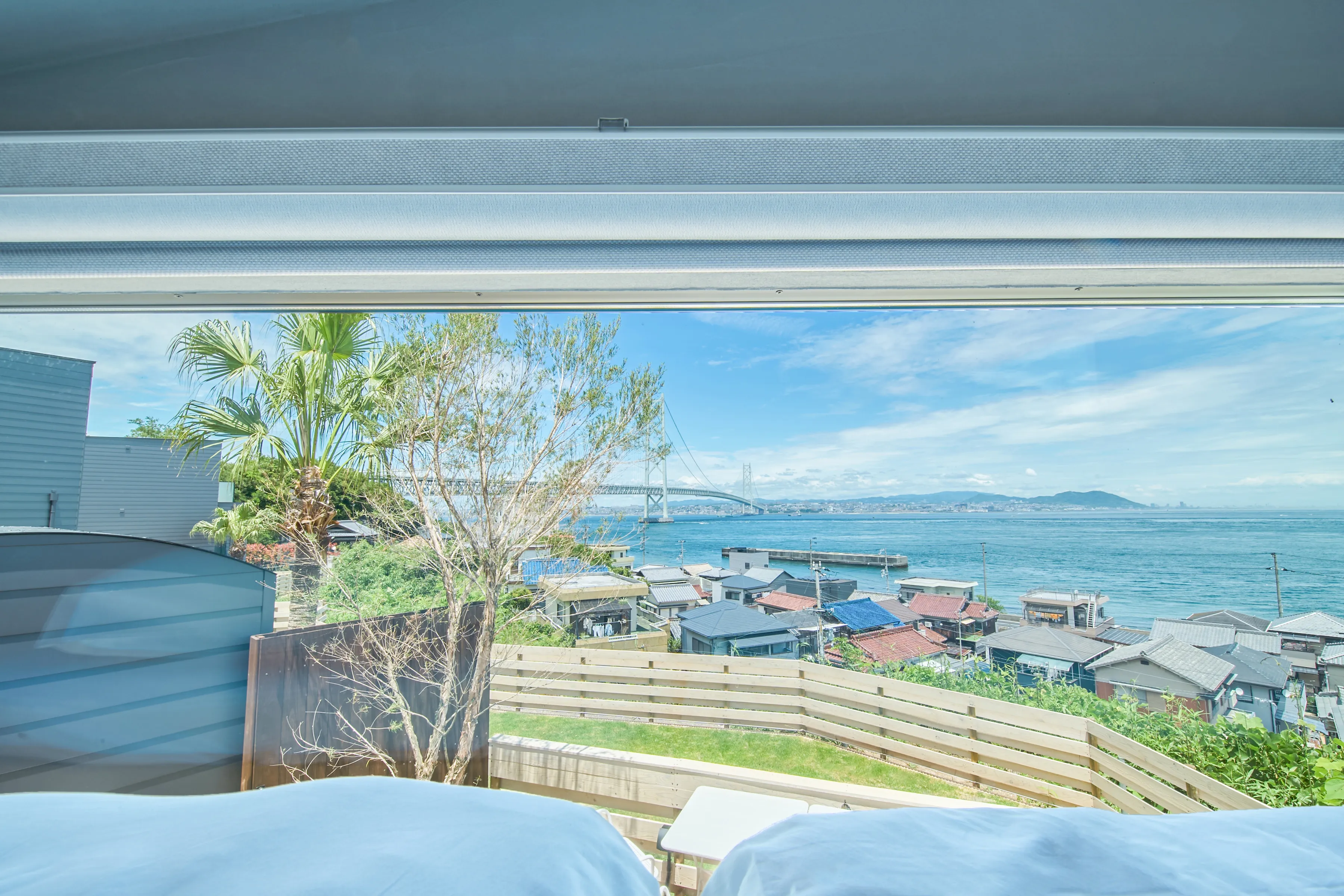 | villa #2 | 明るく洗練された空間 | 約 100 ㎡ | 1〜5 名 | リビング 1 階 / 寝室 2 階 / 浴室から明石海峡 大橋ビュー / 1階、ミニドッグラン横での BBQ(小雨可) |